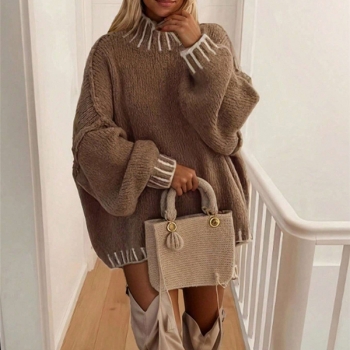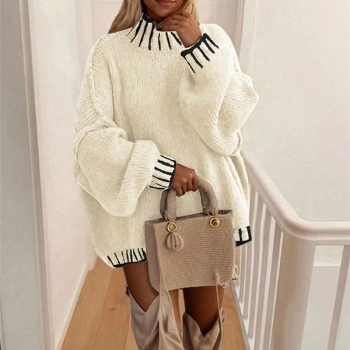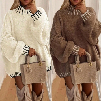 Fashion Contrast Color Mock Neck Long Sleeve Loose Knitted Sweater