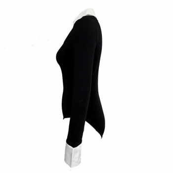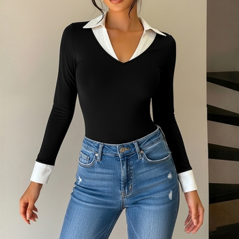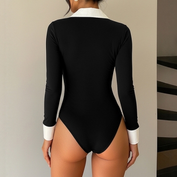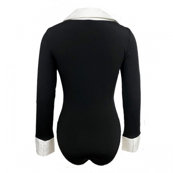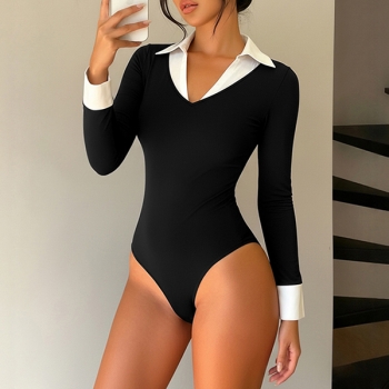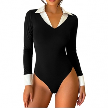 Fashion Contrast Color Stand Collar V-neck Long Sleeve Bodysuit