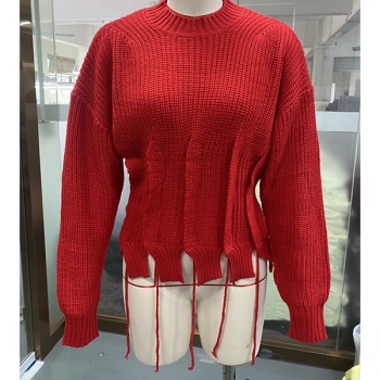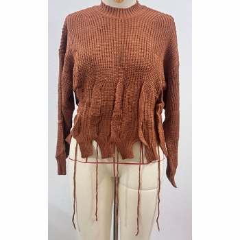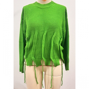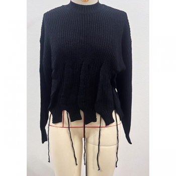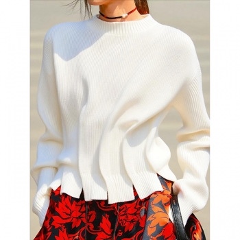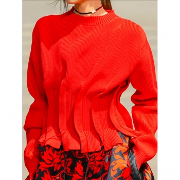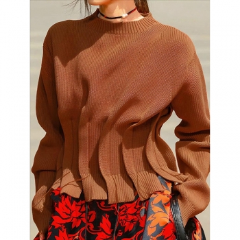 Fashion Crew Neck Long Sleeve Pleated Knitted Sweater