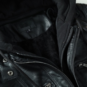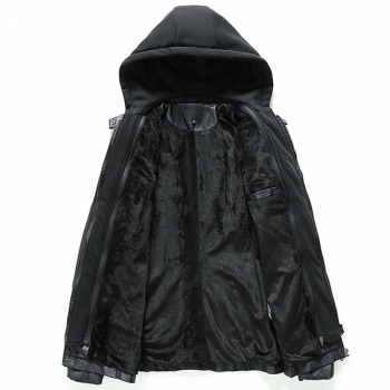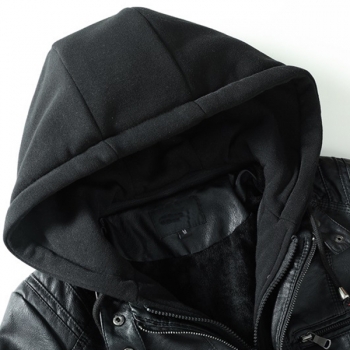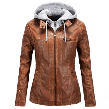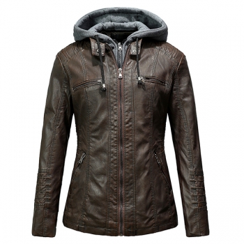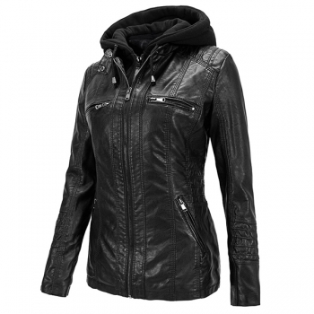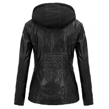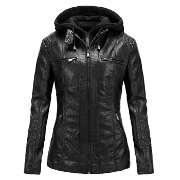 Fashion Detachable Drawstring Hooded Long Sleeve Multi-pockets Plush-lined Artificial Leather PU Jacket for Women