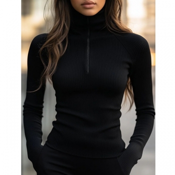 Fashion Half-zipper Mock Neck Long Sleeve Ribbed Shirt