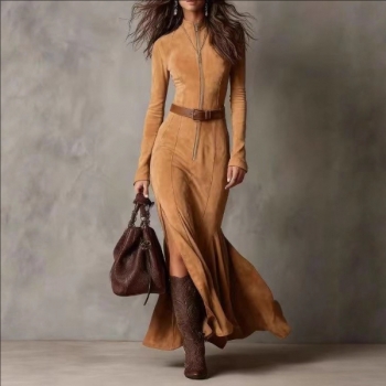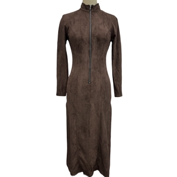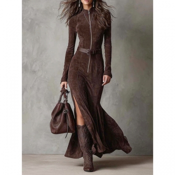 Fashion Half-zipper Mock Neck Long Sleeve Side Split Maxi Dress---Without Belt