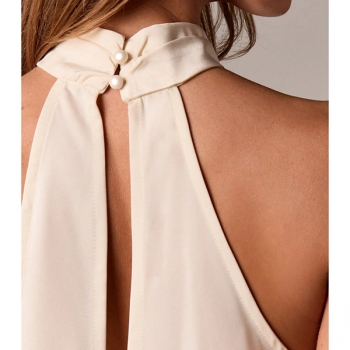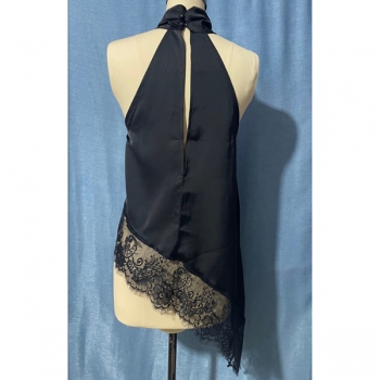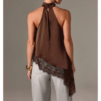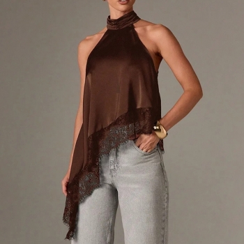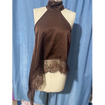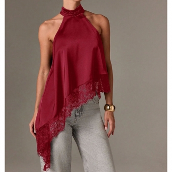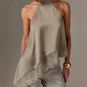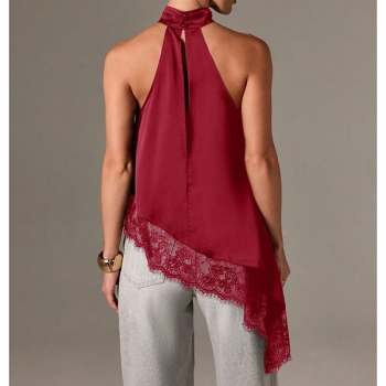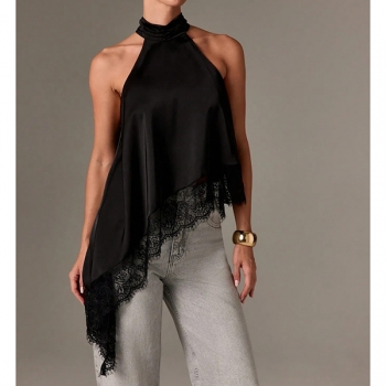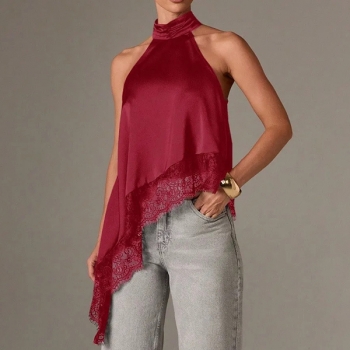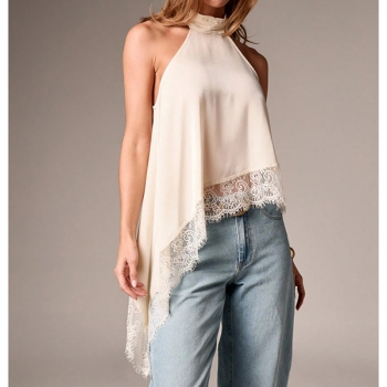 Fashion Halterneck Lace Spliced Irregular Hemline Shirt