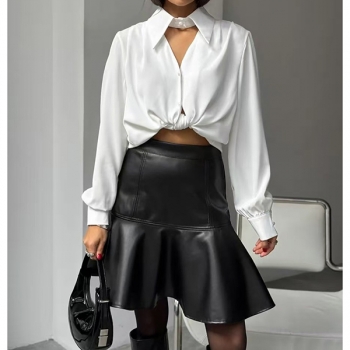 Fashion High-rise Ruffle Hemline Artificial Leather PU Skirt