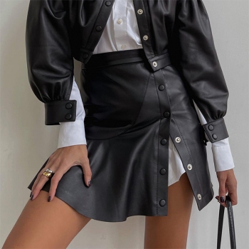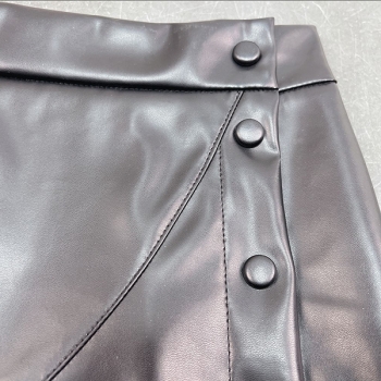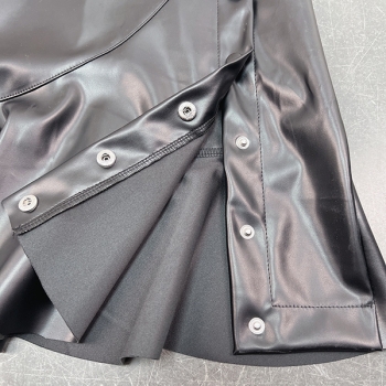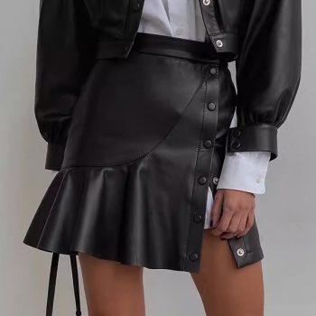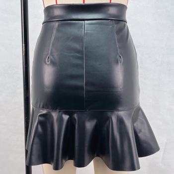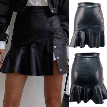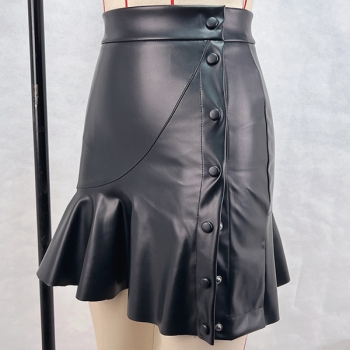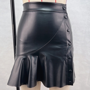 Fashion High-rise Side Button Slit Ruffle Hemline Artificial Leather PU Skirt