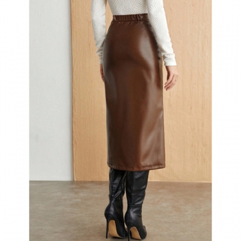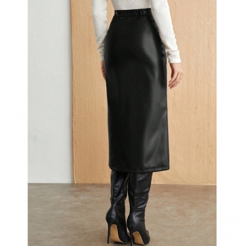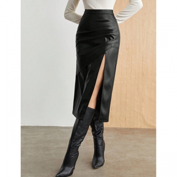 Fashion High-rise Side Slit Ruched Artificial Leather PU Skirt