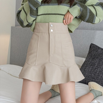 Fashion High Waist Ruffle Hem Slim Fit PU Leather Skirt