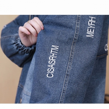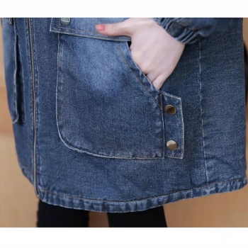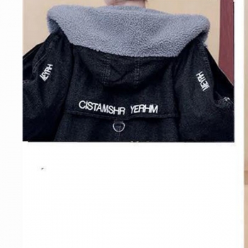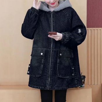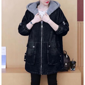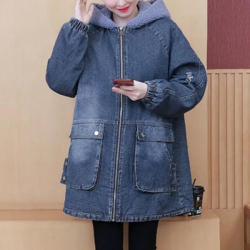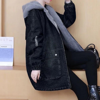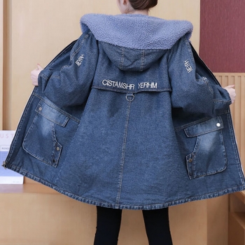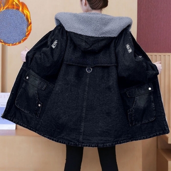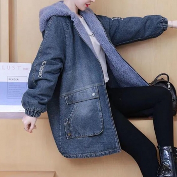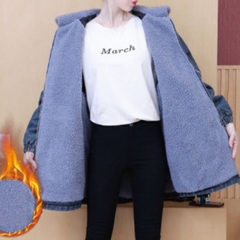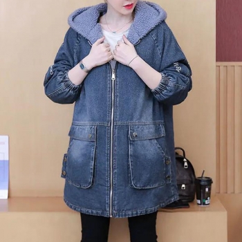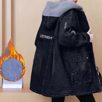 Fashion Hooded Long Sleeve Plush Lined Old-washed Denim Jacket
