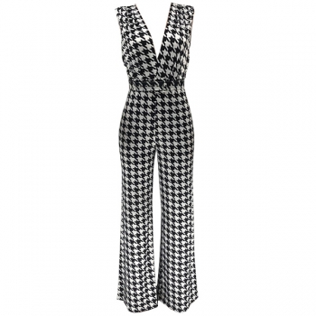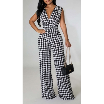 Fashion Houndstooth Printed V-neck Sleeveless Wide-leg Jumpsuit