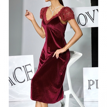 Fashion Lace Spliced V-neck Cap Sleeve Velvet Nightwear Dress