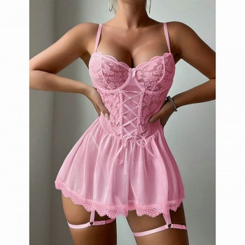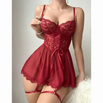 Fashion Lace-up Lace Spliced Gauze Semi-through Nightwear Dress
