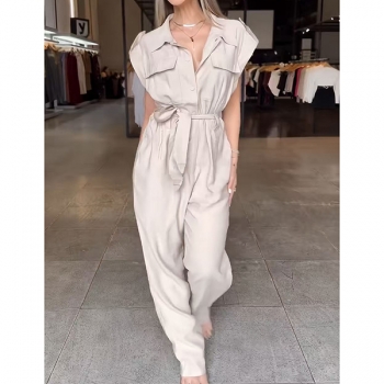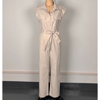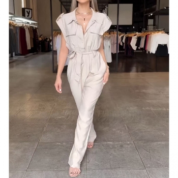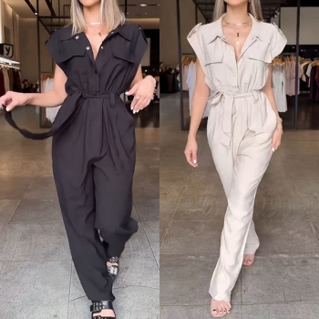 Fashion Lapel Collar Front Button Patch Pockets Self-tie Cargo Jumpsuit