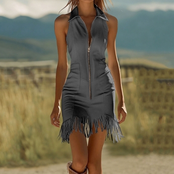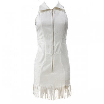 Fashion Lapel Collar Sleeveless Front Zipper Fringed Hemline Bodycon Dress