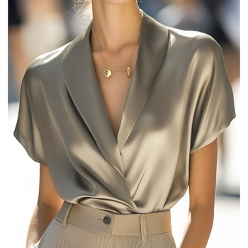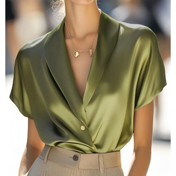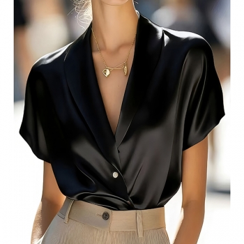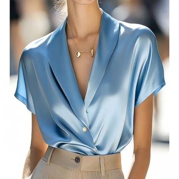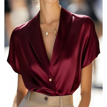 Fashion Lapel V-neck Short Sleeve Satin Shirt