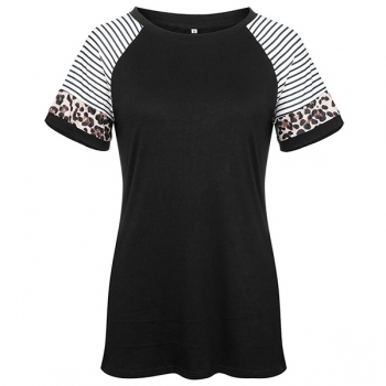 Fashion Leopard Stripe Spliced Short Sleeve Round Neck T-shirt