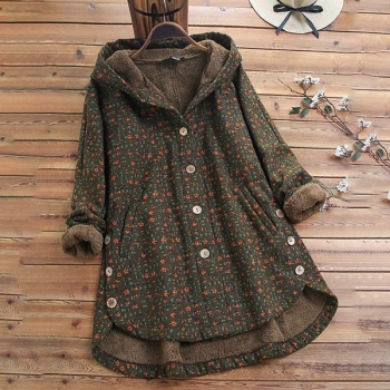 Fashion Long Sleeve Hooded Plush Lining Plaid Printed Coat