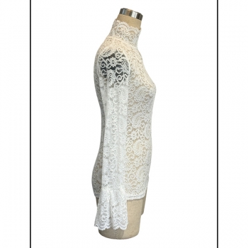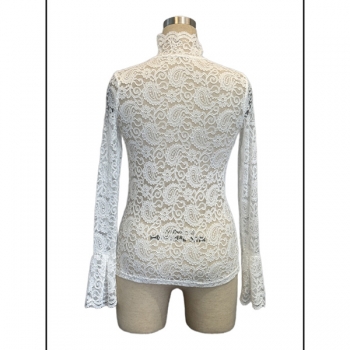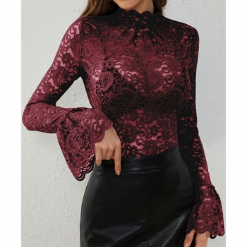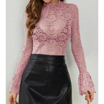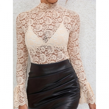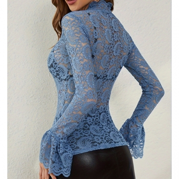 Fashion Mock Neck Trumpet Long Sleeve Semi-through Lace Shirt