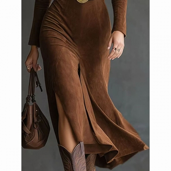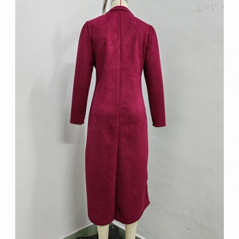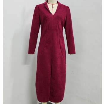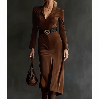 Fashion Notch Lapel V-neck Long Sleeve Slit Dress with Belt