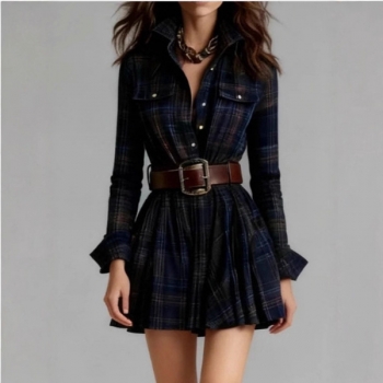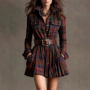 Fashion Plaid Stand Collar Front Button Long Sleeve Side Pockets Mini Dress