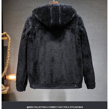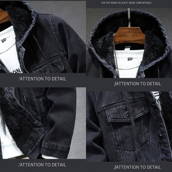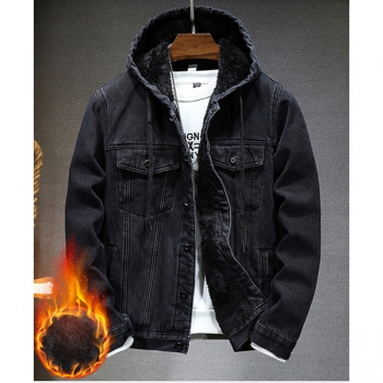 Fashion Plush Lined Drawstring Hooded Long Sleeve Old-washed Denim Jacket for Men