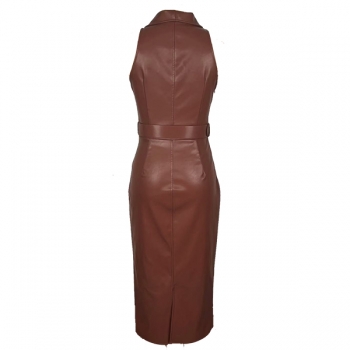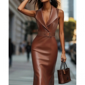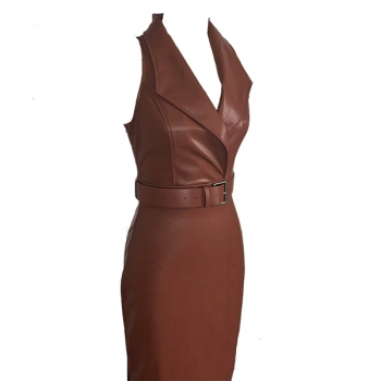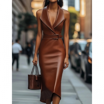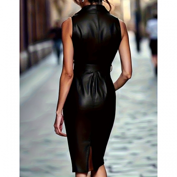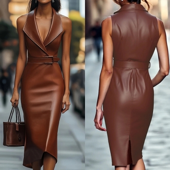Fashion PU Leather Spliced Notched Lapel Short Sleeve Slim Fit Dress