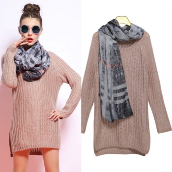 Fashion Round Neck Long Sleeve Slit Sweater + Scarf