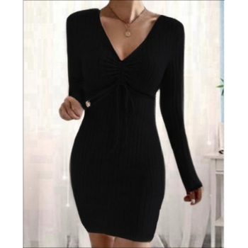 Fashion Ruched Drawstring V-neck Long Sleeve Ribbed Bodycon Dress