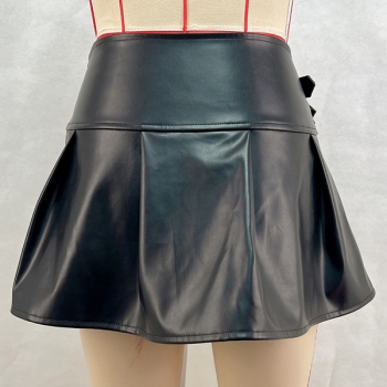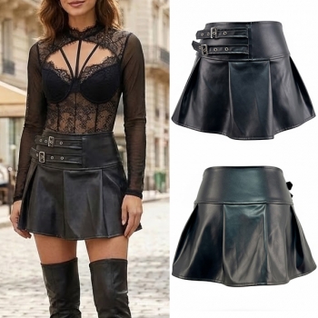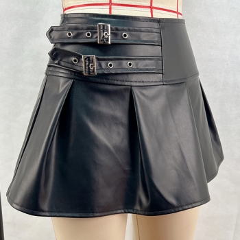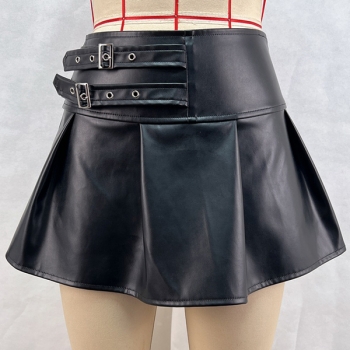 Fashion Side Buckle High-rise Ruffle Artificial Leather PU Skirt
