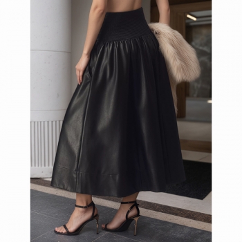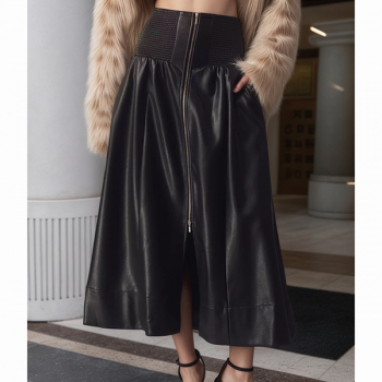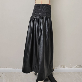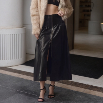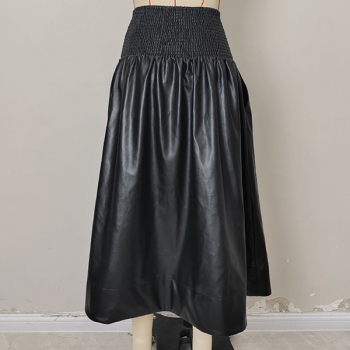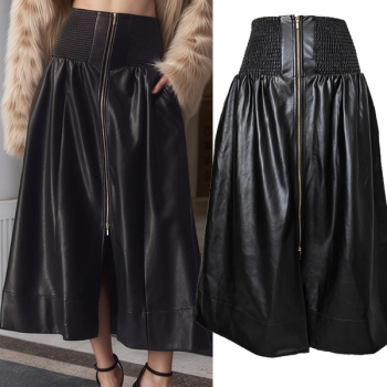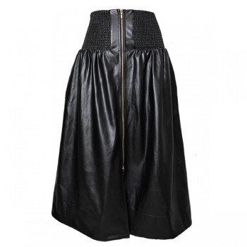 Fashion Smocked Waist Front Zipper Slit Artificial Leather PU A-lined Skirt