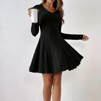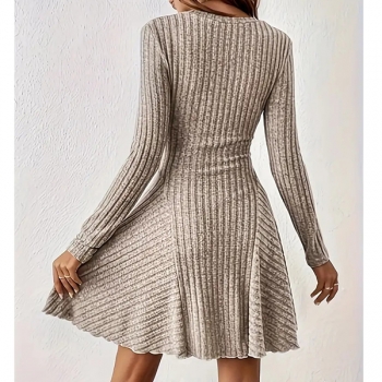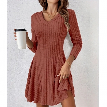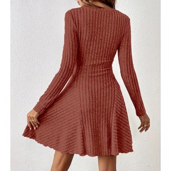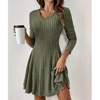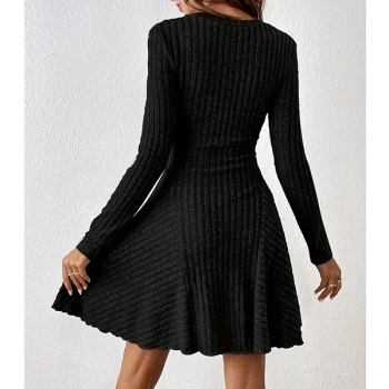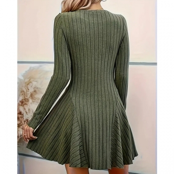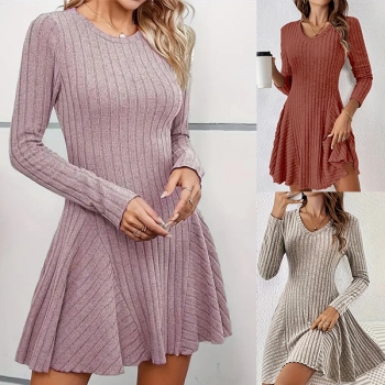 Fashion Solid Color Crew Neck Long Sleeve Ruffle Hemline Mini Dress