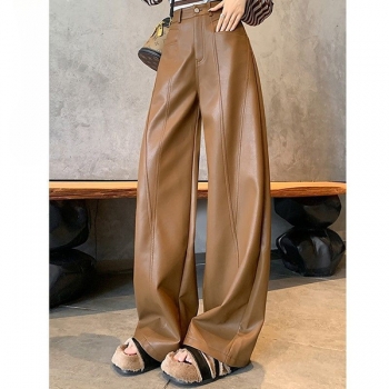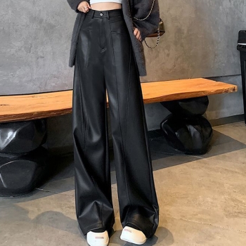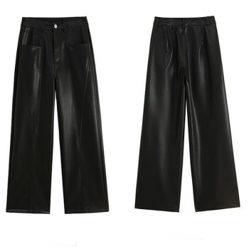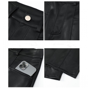 Fashion Solid Color High Waist Patch Pocket Artificial Leather PU Pants