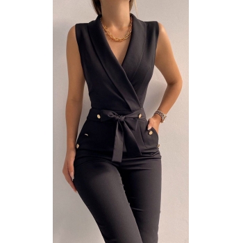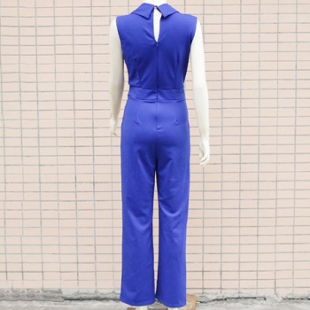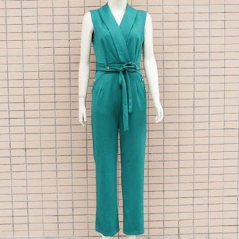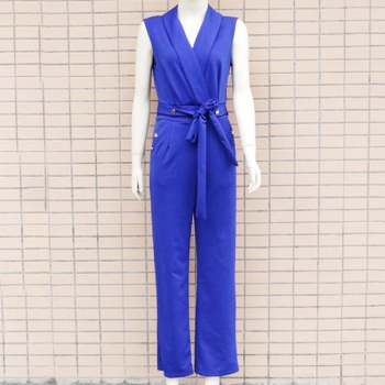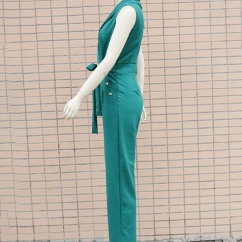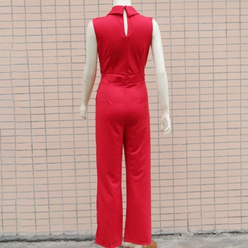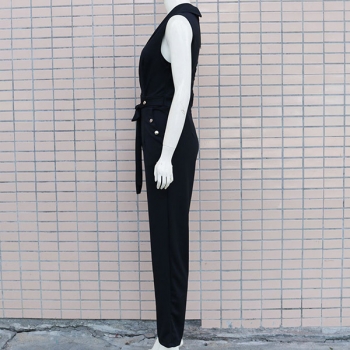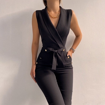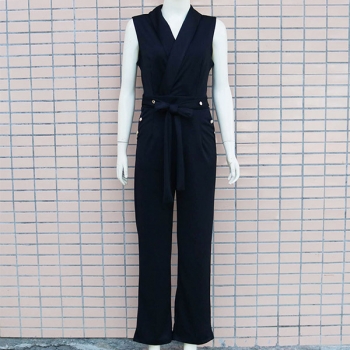 Fashion Solid Color Lapel V-neck Buttoned Self-tie Jumpsuit