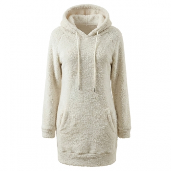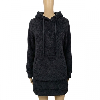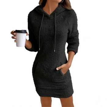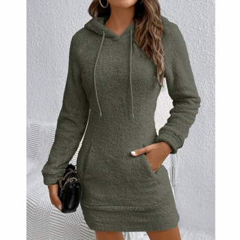 Fashion Solid Color Long Sleeve Kangaroo Pockets Drawstring Hooded Plush Dress