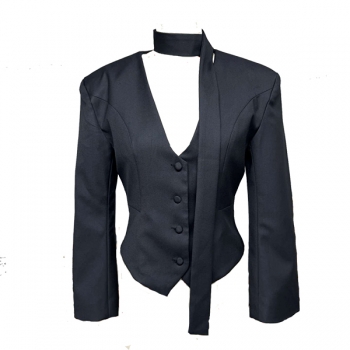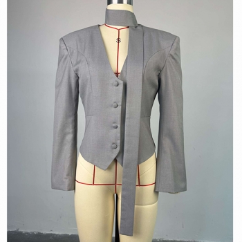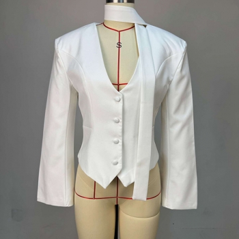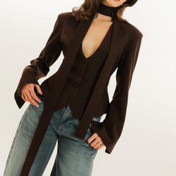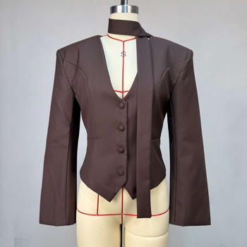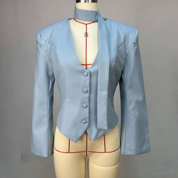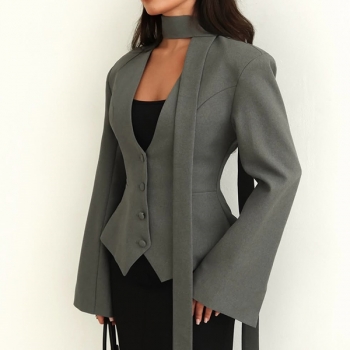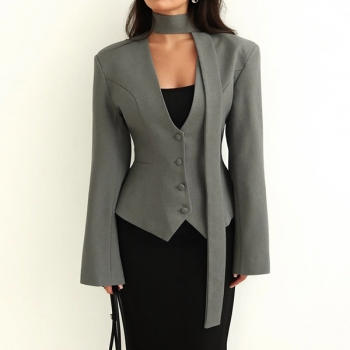Fashion Solid Color V-neck Long Sleeve Front Button Blazer with Scarf