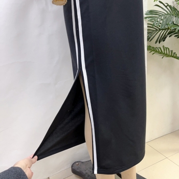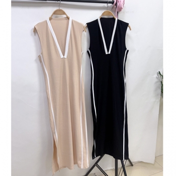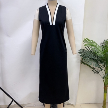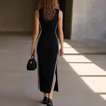 Fashion Sporty-Chic Midi Dress: Black & White Contrast Stripe Sleeveless Dress with Side Slit