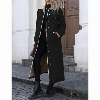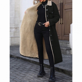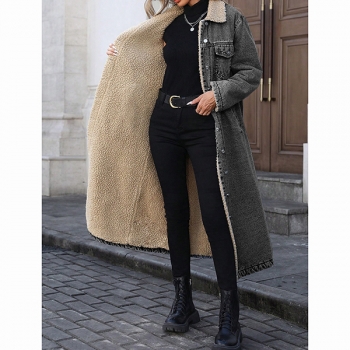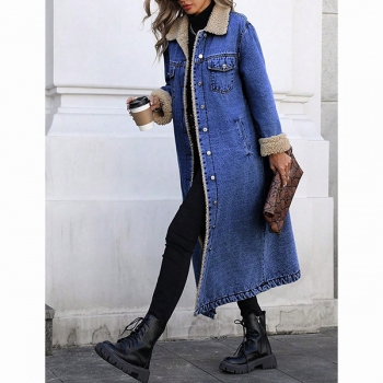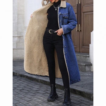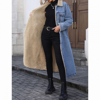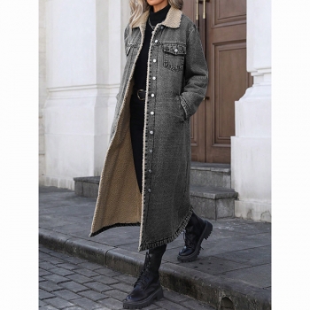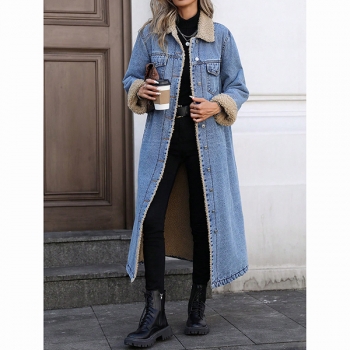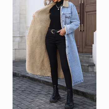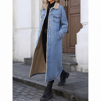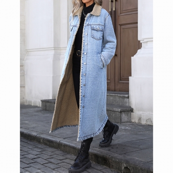 Fashion Stand Collar Long Sleeve Warm Plush Lined Longline Old-washed Denim Jacket