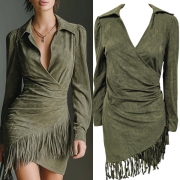 Fashion Stand Collar V-neck Long Sleeve Knitted Sweater Dress