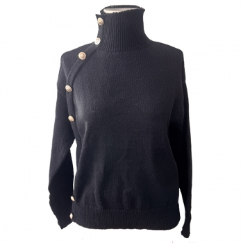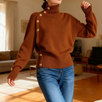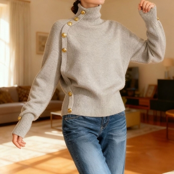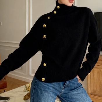 Fashion Turtleneck Long Sleeve Side Button Decoration Knitted Sweater