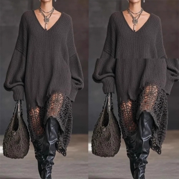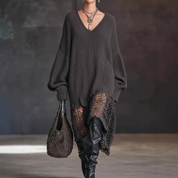 Fashion V-neck Batwing Long Sleeve Lace Spliced Hemline Knitted Sweater Dress