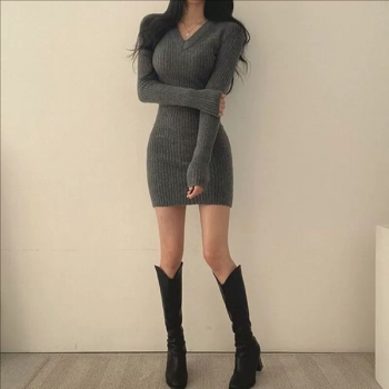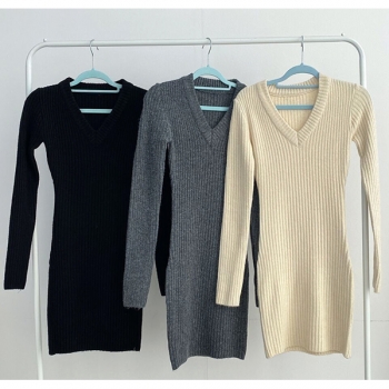 Fashion V-neck Long Sleeve Ribbed Sweater Dress