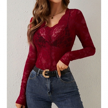 Fashion V-neck Long Sleeve Semi-through Lace Shirt