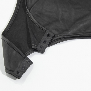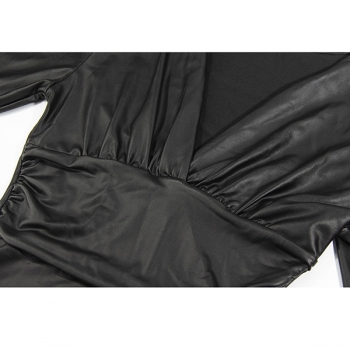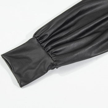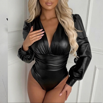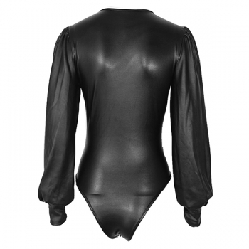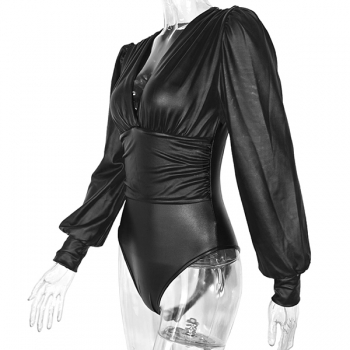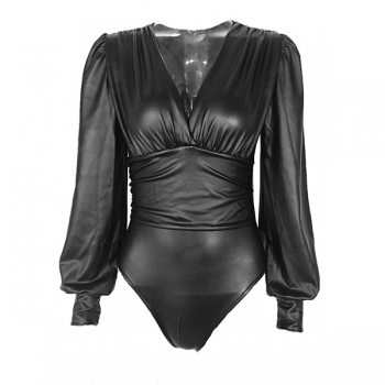 Fashion V-neck Puff Long Sleeve Artificial Leather PU Bodysuit