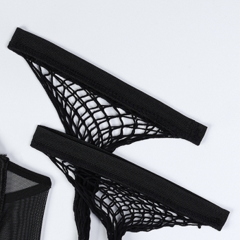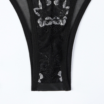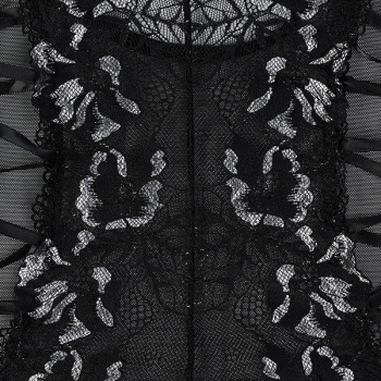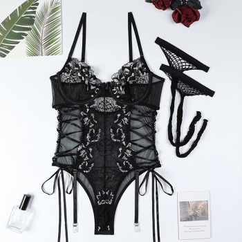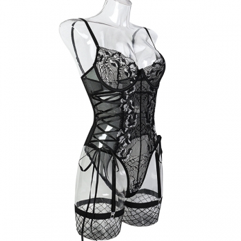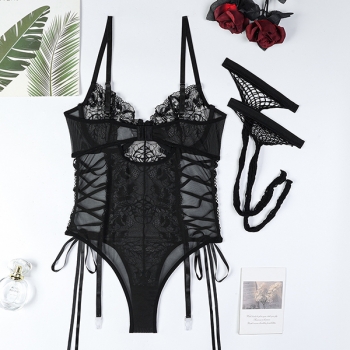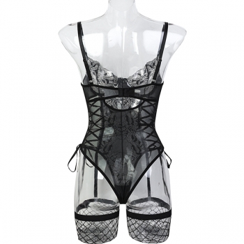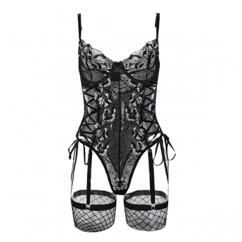 Sexy Floral Printed Jacquard Side Lace-up Lace Lingerie Bodysuit with Mesh-net Socks