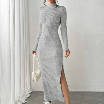 Long Sleeve Maxi Dress with Round Neckline featuring Slit Design