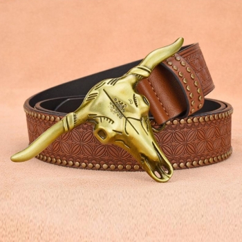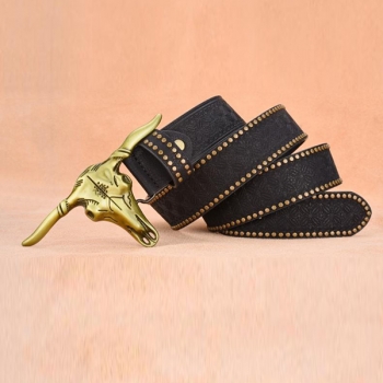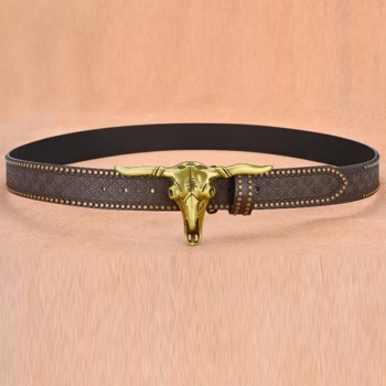 Men's Vintage Western Cowboy Belt with Large Bull Skull Buckle - Studded Embossed PU Leather Strap
