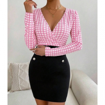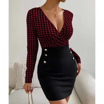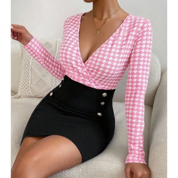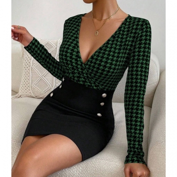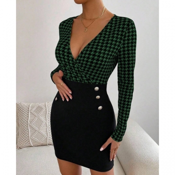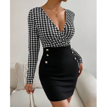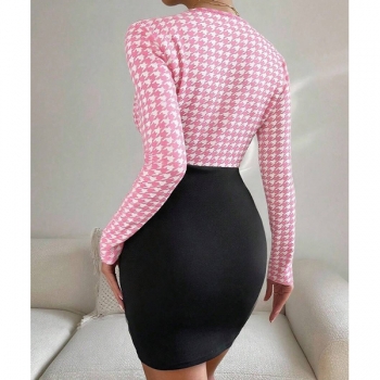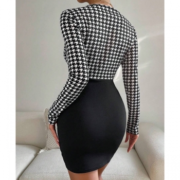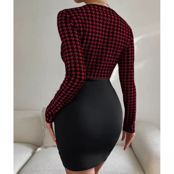 Sexy Backless Square Collar Long Sleeve Slim Fit Houndstooth Dress