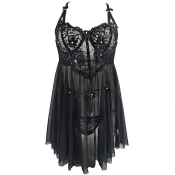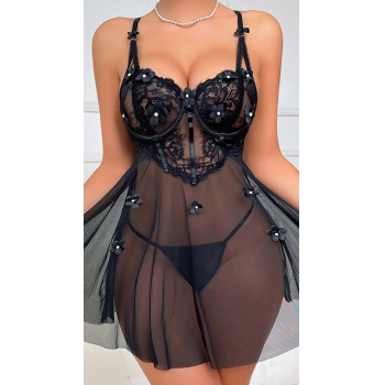 Sexy Embroidered 3D Floral Decoration Sweetheart Neckline Lace Spliced Gauze Nightwear Dress