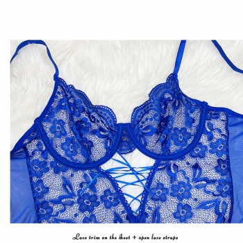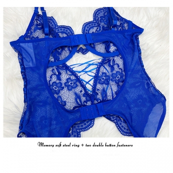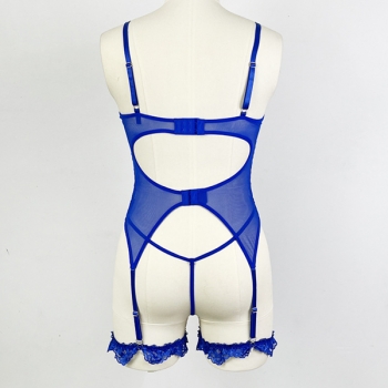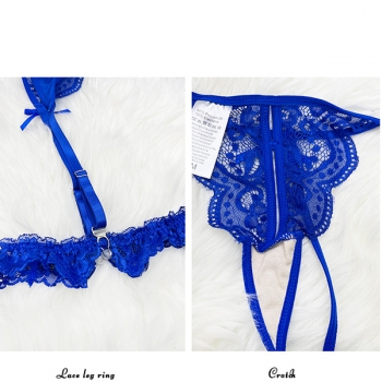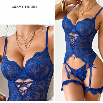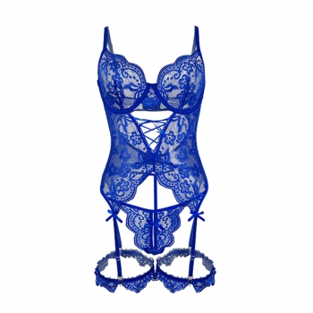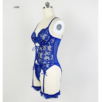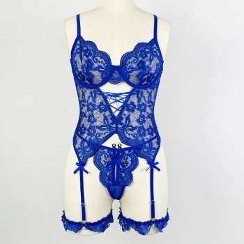 Sexy Floral Embroidery Lace-up Bowknot Ruffle Two-piece Lace Lingerie Set