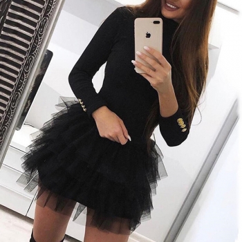 Sexy Gauze Spliced Hem Long Sleeve Slim Fit Mini Dress Short Dress(It runs small)