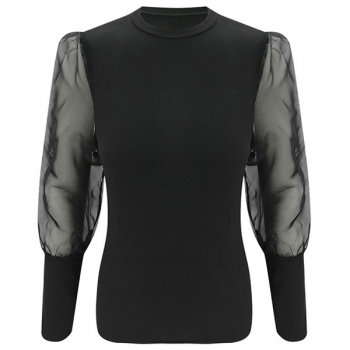 Sexy Gauze Spliced Puff Sleeve Round Neck Solid Color Top